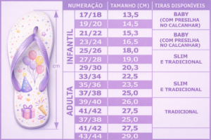 - Baby: com presilha no calcanhar (numeração 17/18 a 21/22)
